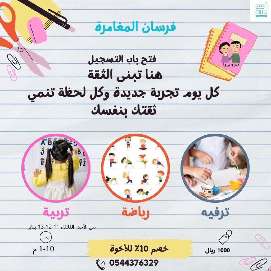 معسكر ترفيهي في إجازة منتصف العام الدراسي والإجازة الصيفية للبنين والبنات ليتعلموا فيها مهارات مختلفة ويقضوا أوقات سعيدة لاتنسى من الذاكرة مع مجموعة من أبرز المعلمين والكوادر المتخصصة في كل مجال ليساعدوا الطفل على تنمية مهاراته وزيادة معرفته وقوة شخصيته وتأكيد ثقته بنفسه